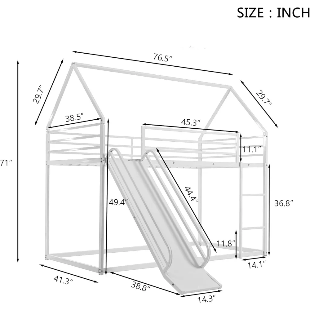• 【Creative Playhouse Bunk Bed with Slide】Simple and interesting appearance gives your creativity free reign and you can decorate this house bed with your boys and girls,giving full play to imagination. Featuring a low slide for boys and girls to play,this bunk bed can add fun to boys and girl and developr sense of balance and coordination.