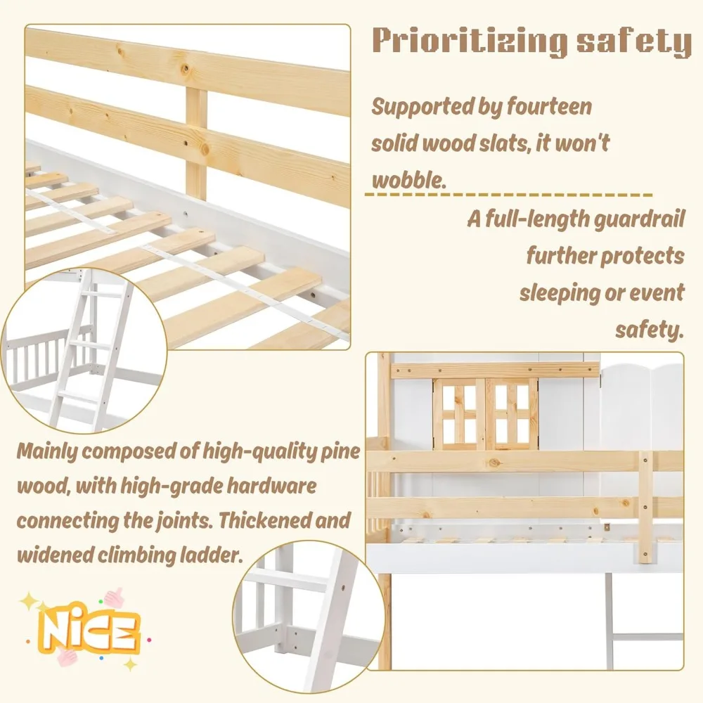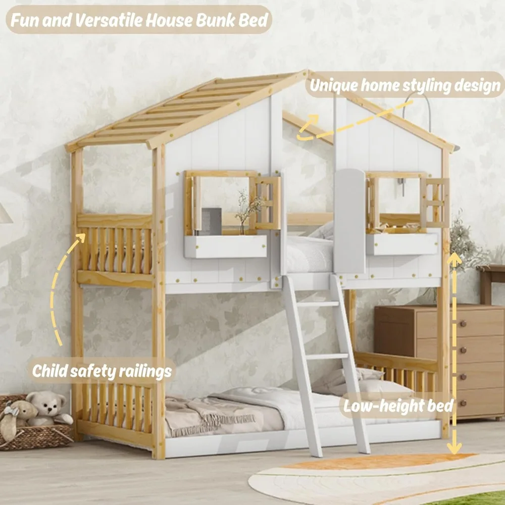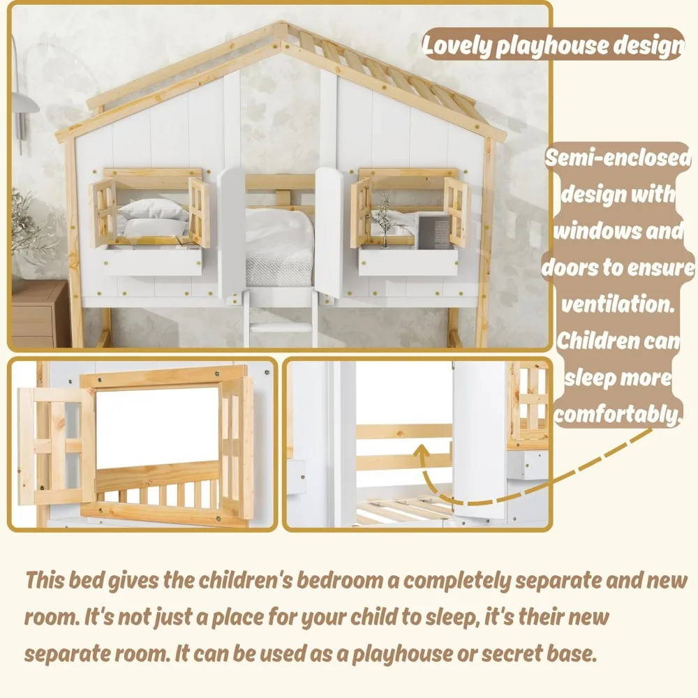• 💖💖【 Playhouse Bunk Beds for Girls Boys 】 This bunk bed twin over twin featuring windows,door,ladder,provides your kids with endless imagination and access to the natural woods, while they go to bed and fall asleep. They can put various decorations and accessories on the window boxes to accompany their whole sleep and daily activities.